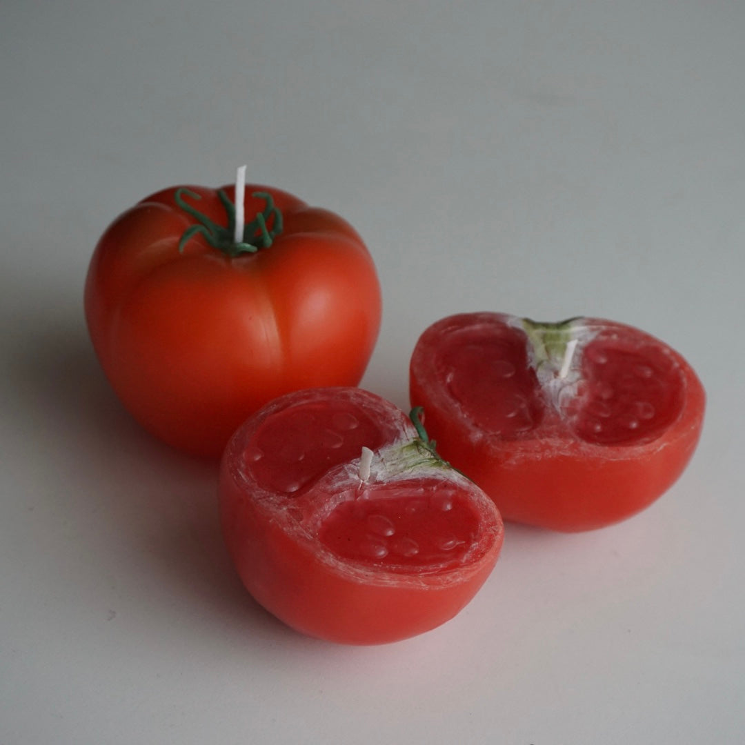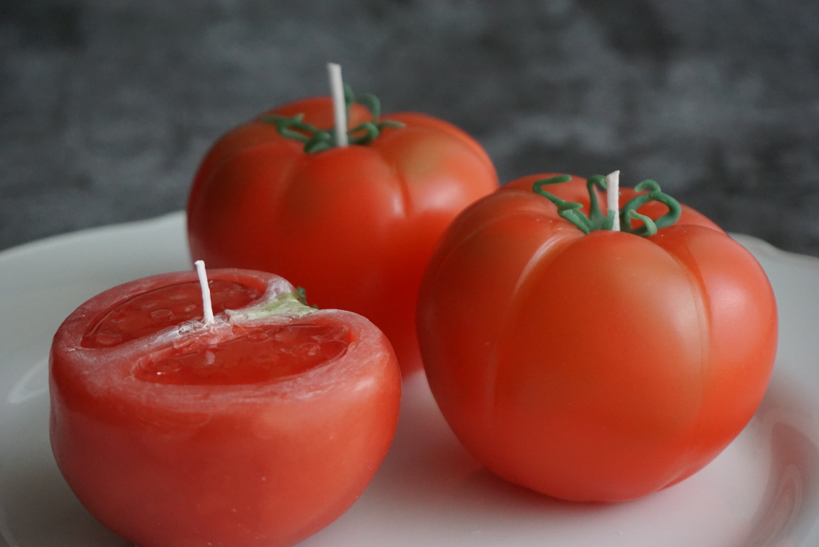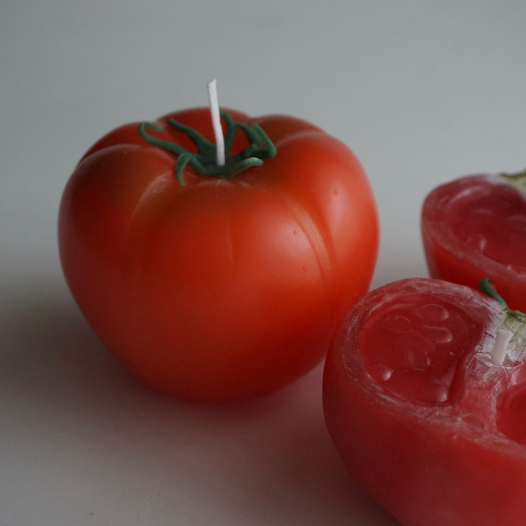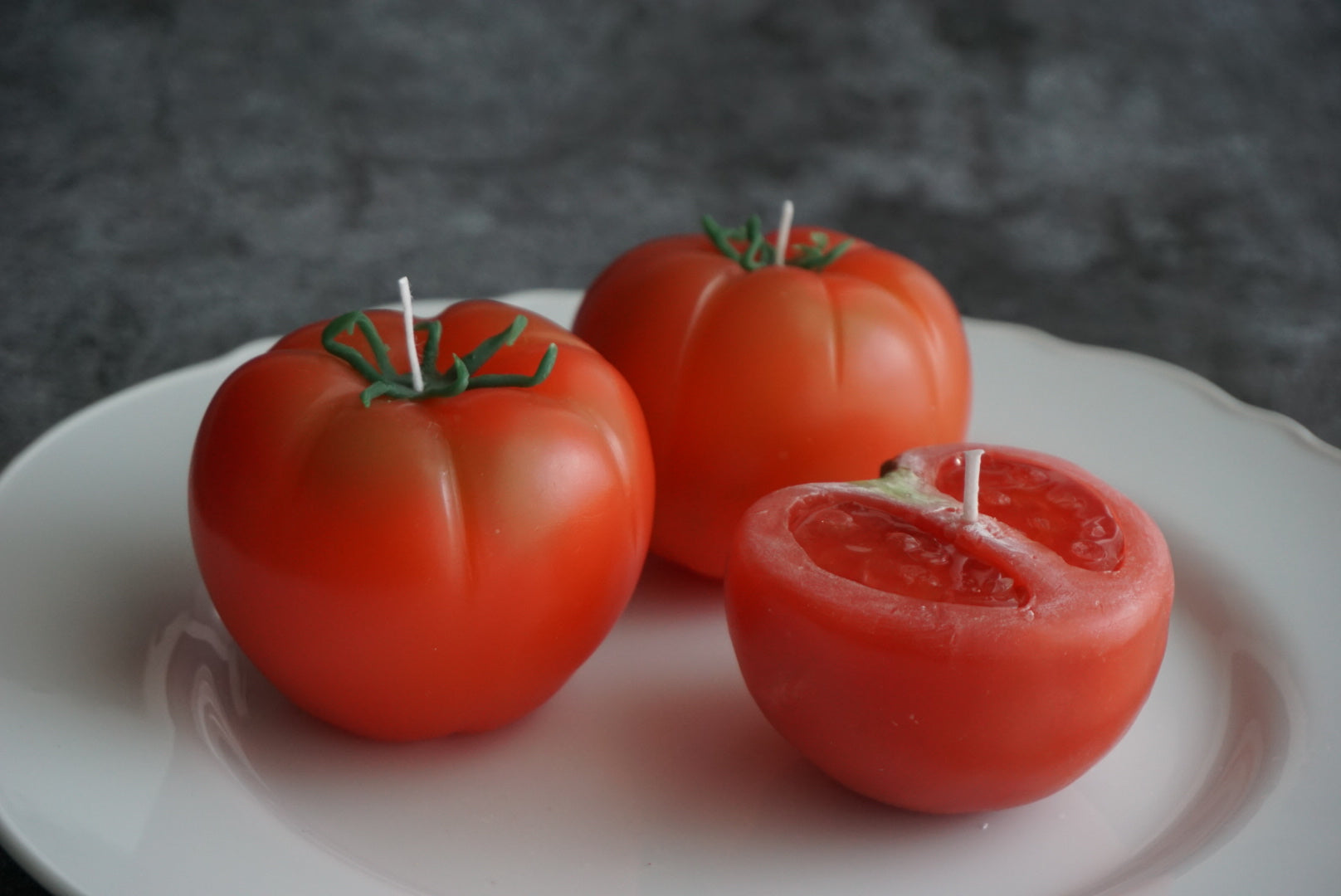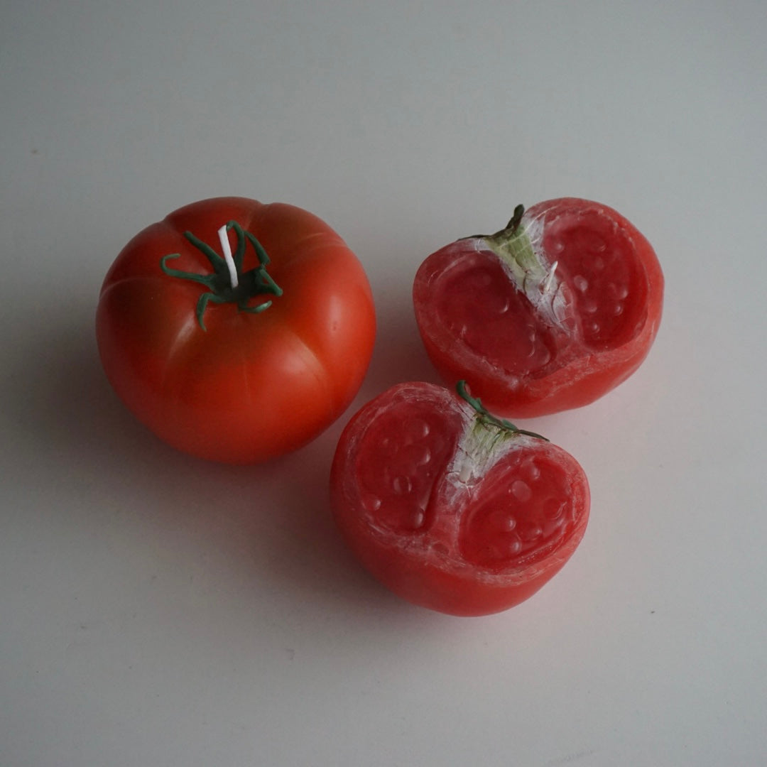 「えっ、これって本物のトマト?」と思わず二度見してしまうほどリアルなキャンドル。丸実・半実別売りです。