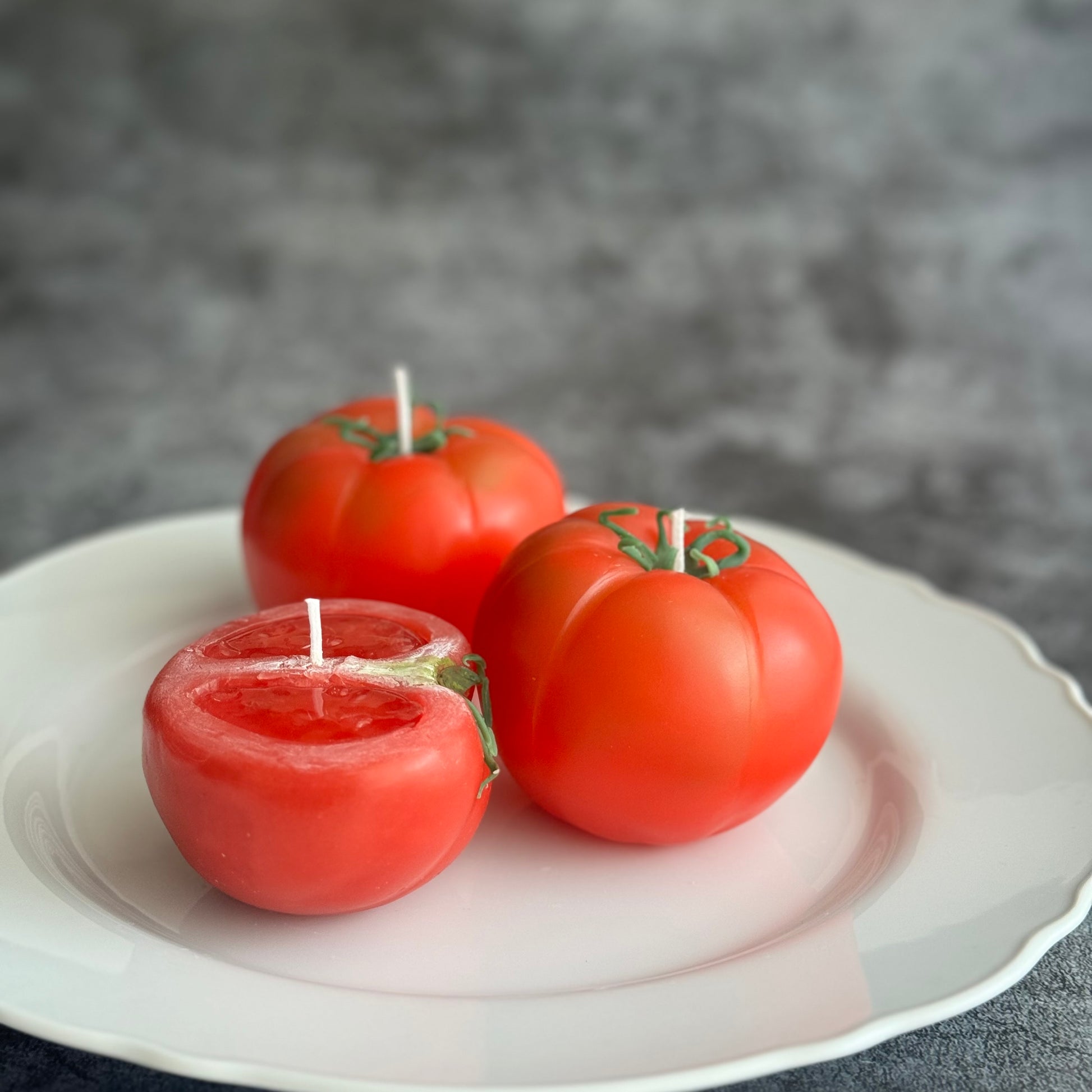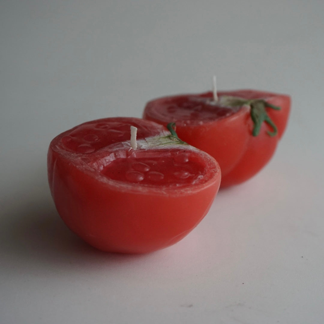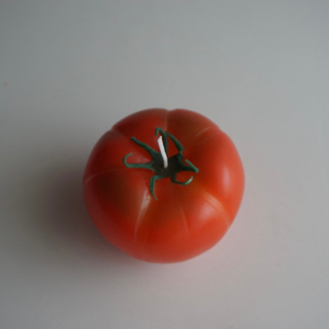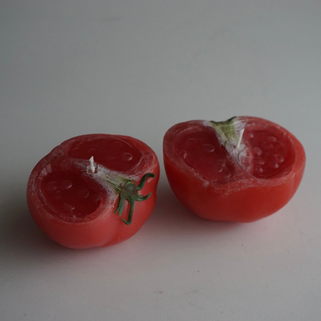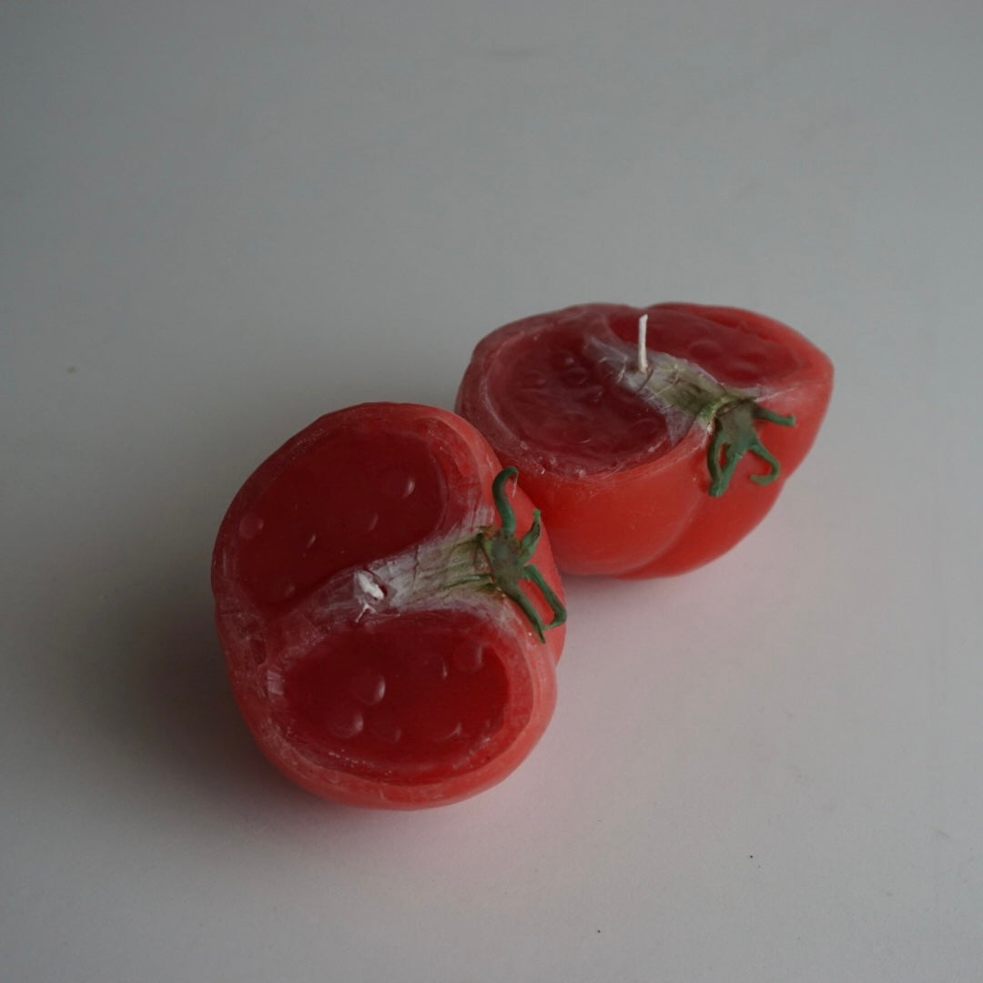 「えっ、これって本物のトマト?」と思わず二度見してしまうほどリアルなキャンドル。丸実・半実別売りです。